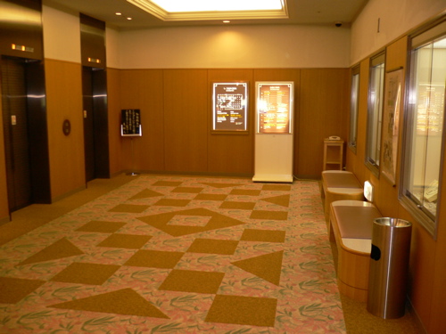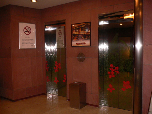フロント階のエレベーターホールも禁煙であること (真ん中の箱は灰皿ではありません、ゴミ箱です)。 |