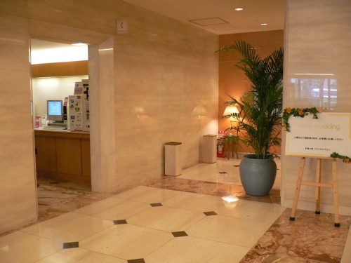 | たとえフロント階の一番隅っこであろうと、空気が連続する部分にこのような灰皿があれば、フロントロビー全体で受動喫煙が発生。加点しない。 | ![]() |