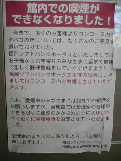 | 京セラドーム | 一部、喫煙室作成。 2007年3月。 喫煙室は利用者が少なかったためか、周囲はタバコ臭くはなかった。