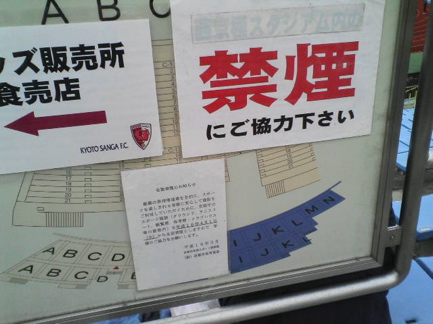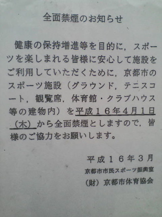 京都市のスポーツ施設は2004年4月から全面禁煙になってます。西京極競技場で京都サンガFCがJリーグの試合をするときも完全に禁煙で、一旦入場したら再入場できないので、試合後に会場を出るまで約2時間(開門時に入れば約4時間)全くタバコを吸うことができません。