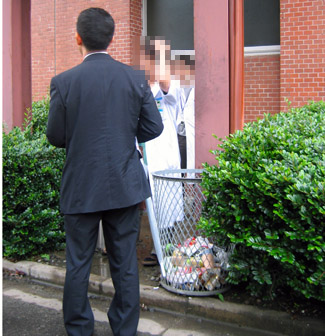 ![]() 札幌医科大学:喫煙容認 正面玄関前の公認喫煙所。白衣を着た人も患者も喫煙していた。 |