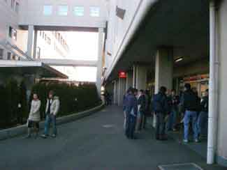 医学生とおぼしき男女が喫煙。(2008年6月) 患者さんは敷地内禁煙ですが・・・。 |