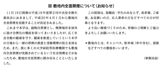 ![]() 産業医科大学ニュース2008年1月号に掲載された敷地内禁煙のお知らせ |