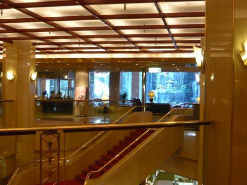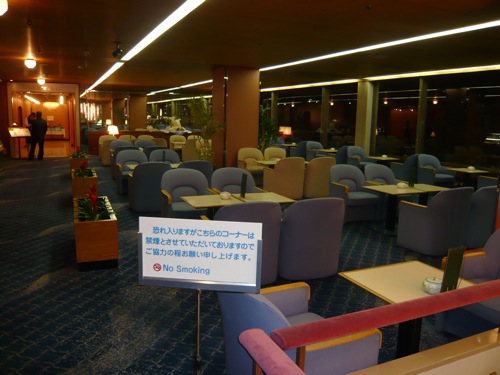 不十分な対策2:吹き抜けをとおして喫煙場所と連続していること。 このホテルは非常に熱心に受動喫煙対策に取り組んでいますが、吹き抜けの2階の喫煙コーナーがフロントに連続しています。この点以外は優良ホテルなのですが・・。 類似のパターンは多数ありました。 |