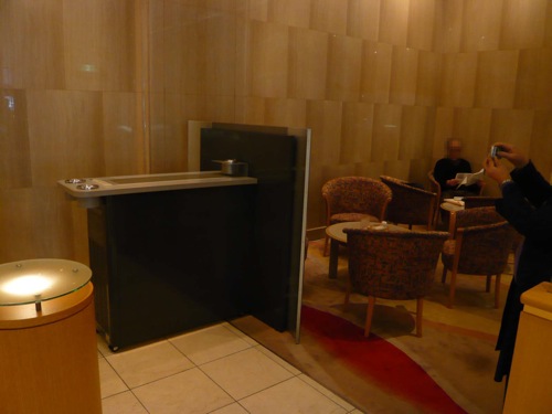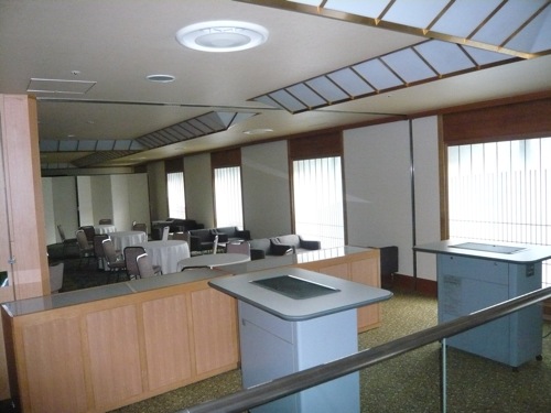 次善の対策:フロントロビー 「喫煙する人もお客様で閉め出すわけにはいかない」という考え方も現時点では仕方ありません。 ホテル日航プリンセス京都のフロントには収納スペースを改造した喫煙室が2005年以前からあります。レストランも全席禁煙として、受動喫煙対策に積極的に取り組んでいますが、吹き抜けの2階の部分にある喫煙コーナーが残念。 |