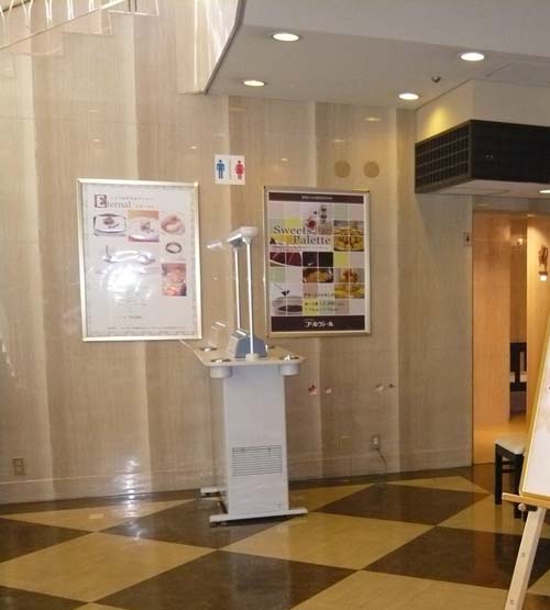 不十分な対策1:空気清浄機を置くこと。 このホテルは1階ロビーが禁煙、レストランも全て終日禁煙と良好なホテルなのですが、2階のレストラン前に置いてある空気清浄機だけが不十分な点です。繰り返しますが、空気清浄機を置いても何の解決にもなりません。吸い込み能力が低い上に、有害物質のほとんどが素通りして排気口から出てきます。 |