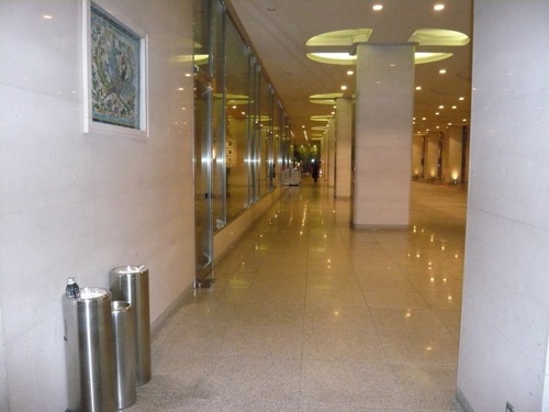 出入口の次善の対策: 出入口とは離れた場所に灰皿を置いたホテルです。写真の一番奥に見える出入口とは100m近く離れていました。 ただし、屋根に覆われていますから、灰皿が風上になれば、出入口まで煙は漂うでしょう。 もちろん、ベストは出入口には灰皿を置かないことです。 |