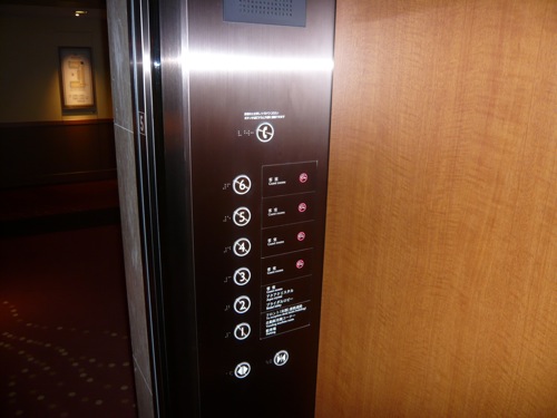 新・都ホテル: サウスウィングのエレベーターのボタンの横には禁煙フロアのマークがついています。サウスウィングは客室の8割が禁煙ルームでした。 |
