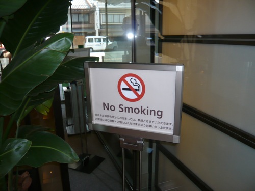 良好な対策: 某チェーンホテルは、フロントロビーは完全禁煙、空間として連続するエレベーターホールも禁煙、出入口にも灰皿無し。全くタバコ臭くありません。これが、理想の対策です。 ただし、ロビー内に禁煙であることを示すサインがありませんでした。もし、下のような健康増進法の主旨を添えた禁煙のマークや表示があれば完璧です。 |