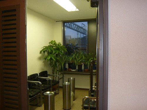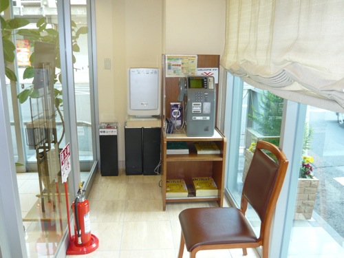 次善の対策:共有スペースに喫煙ブース ザ・パレスサイドホテル 2階の共有スペースの一角に小型換気扇を備えた喫煙ブース。ドアではなくスクリーンを使用しているので、漏れは少ない。下の写真のようなドアをつけるよりもずっと効果的。 |