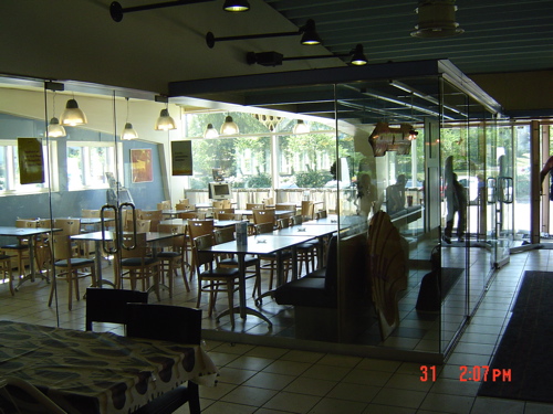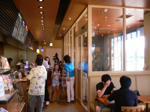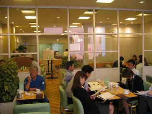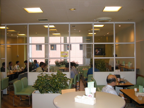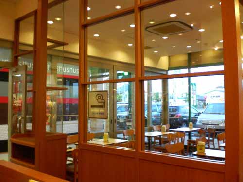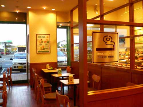 ミスタードーナッツ、福井ベル店 「ガラス壁で分離されているものの、入り口は開口している。禁煙席までの拡散はさほど強くはないが、全くゼロではない。」 情報提供:山村先生 06年8月 |