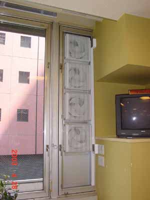 某企業、事業場内の喫茶店 手前が禁煙席、奥が喫煙席、 間にガラス製の壁を設置。 出入口2カ所。 喫煙席側の右端の細長い窓のガラスを外して換気扇4台設置(テレビの横)。 |