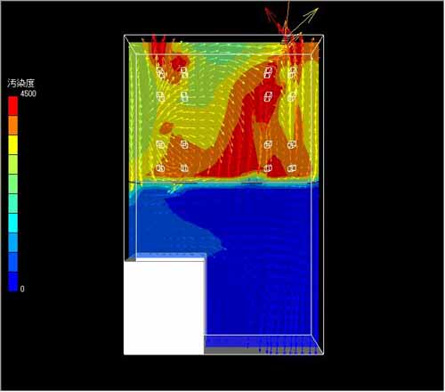 同上の粉じん濃度をシミュレーション。 白い四角は喫煙者を示す。 壁の手前(下)の禁煙区域の汚染はなく、空間分煙となっている(白い部分は厨房)。 |