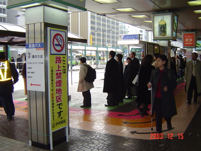東京駅 路上喫煙禁止の導入とともに東京駅周囲のバス停エリアも禁煙となる。 情報:大和 |